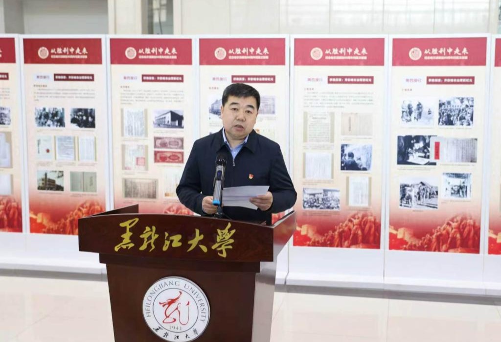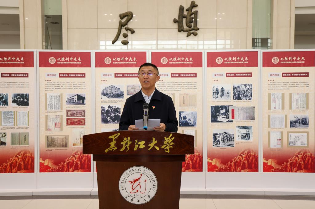 迟宝旭在致辞中表示,本次展览通过呈现哈尔滨解放与建设发展的壮阔历程,传承弘扬了哈尔滨红色文化与革命精神。他指出,黑龙江大学与哈尔滨市档案馆长期保持深度合作,未来将继续携手共建馆校育人平台,讲好哈尔滨红色故事。他希望广大师生通过本次展览,能够更加深入地了解哈尔滨的光辉历史,赓续红色基因,汲取前行力量,在新时代新征程上勇担使命、实干笃行。